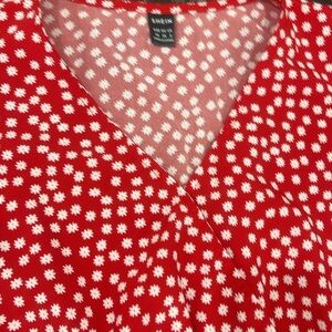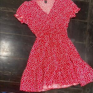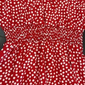 Charming red dress with white daisy flowers. Features a flattering fit and short sleeves. New! Size XS