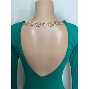 It has a gorgeous gold chain with faux diamond stones in it on the back. The deep cut back is very sexy.