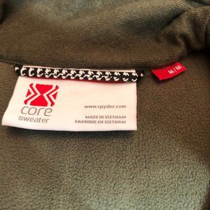 Spyder Core Sweater / Knit Jacket. Designed for skiing / snowboarding, this functional design makes for great streetwear. Unique asymmetric details. Cool logo. Substantial, warm yet breathable fabric. Zip front. Zip pockets. Dark green. Est retail $228