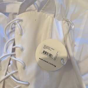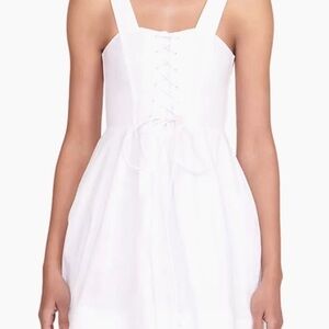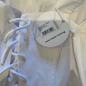 Stylish white dress paired with an orange woven handbag. Perfect for a chic look.