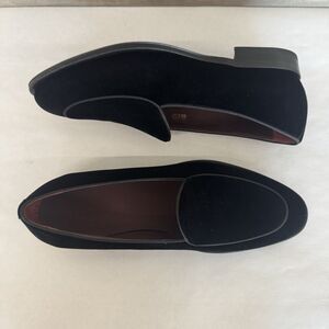 The product is a pair of new without box men's formal slip-on loafers in black velvet from the brand Suitsupply. The shoes have an almond toe shape and are made in Italy. With a sleek design and high-quality material, these loafers are perfect for formal events and add a touch of sophistication to any outfit. The EU size 43 and US size 10 make them a versatile choice for those looking for a designer and elegant shoe option.