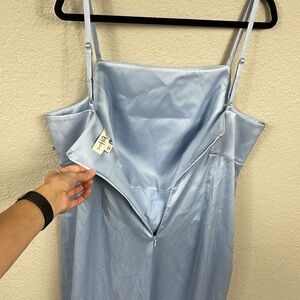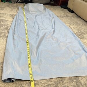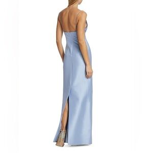 In this softly striking gown, a fabrication of vertical stretch mikado helps the icy blue look hold its elegantly columnar shape.