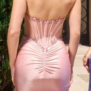 New Sage Beaded Graduation Long Satin Dress w/ Corset Bodice & Leg Slit CD C169