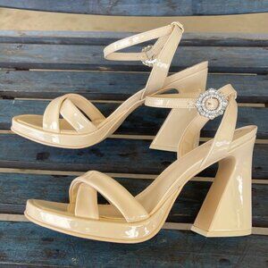 Circus by Sam Edelman Haidyn Women's Cream/White Glossy PU Platform Sandal With Block Heel Rhinestone Buckle. Step out in style with the Circus by Sam Edelman Haidyn platform sandals. These glossy cream/white sandals offer a chic look with comfort and flair, perfect for any fashionable outing.
