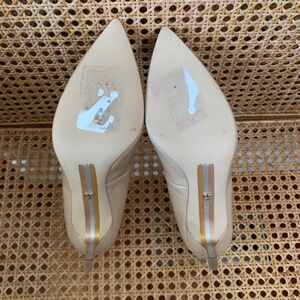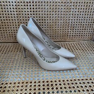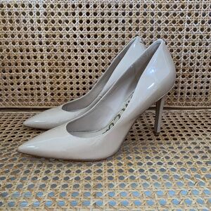 Sam Edelman Hazel Nude Beige patent leather pointed toe heels. Size 8 Narrow. Approximately 3.75" heel. Tried on but never worn. Please note that there is a glare from the gloss of the patent leather in the photos of the backs of the heels. These are new with no flaws.