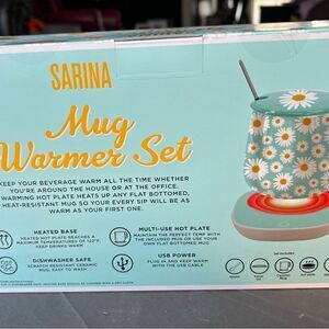 Sarina mug warmer set featuring a charming daisy design. Includes a mug, lid, hot plate, spoon, and USB cable. Perfect for keeping your drinks warm. New! Sarina Mug Warmer Set NWT Mug Lid Hot Plate Spoon USB Cable