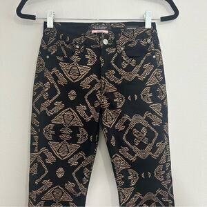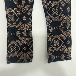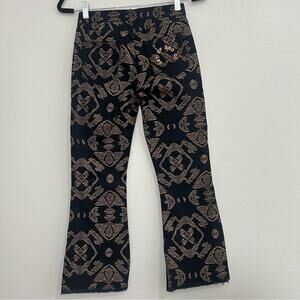 Maison Scotch Scotch & Soda cropped kick flare black printed jeans, with a neutral tan boho abstract geometric design, cropped flared leg, fringe raw hem.