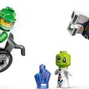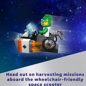 The set also includes a planet exploration vehicle with wheelchair access, a food-delivery drone, 2 space crew minifigures and an alien figure for futuristic play.