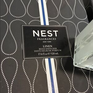 Elegant Nest Linen reed diffuser set. Features a stylish black and white design with blue accents.