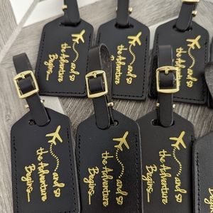 Black luggage tags with gold writing. Perfect as favors for a travel themed bridal shower or wedding event.