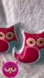 These super cute owl pillows are in colors of hot pink and blue. Brown buttons for eyes. Zips at bottom.
