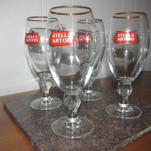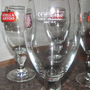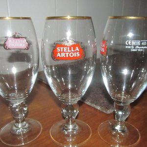 Enjoy this set of 2 beautiful New Stella Artois Chalice Gold Rimmed 40 CL Beer Glasses that were made in Belgium. Never been used. No scratches, chips or discoloration. They feature the beautiful Stella Artois star in the textured stem of the glass and the Stella Artois logo with "Belgium" underneath is on the front side of the glass. Measurements and other info is printed on side of the glass. Bottom is clear glass. The glasses measure about 8 inches tall and about 3 inches wide. Please note: The price is for this set includes 2 glasses. (Sets of 4 are available in a separate listing).