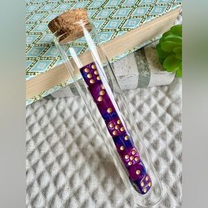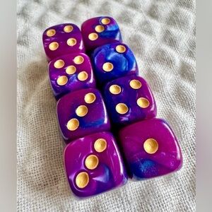 This is a set of eight 15mm dice made of purple and blue swirled acrylic with golden colored pips. The dice are numbered one to six, are square shaped, and are six-sided. Perfect for use with games or even just to display. They come with a glass tube with cork stopper for storage/display and a black drawstring pouch.