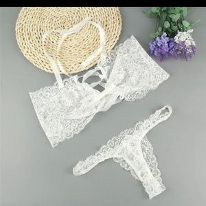 This is so hot! Corset style lace up top with matching thongs white lace with some stretch. Size large if your a med with a larger top it will work also