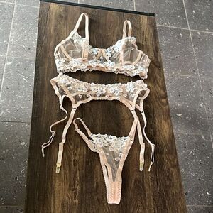 New Sexy Flower Embroidery Lace Three Piece Lingerie Set