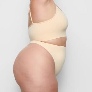 A stretchy shapewear thong that hits at the mid waist for a flat tummy, cinched waist, plus an interior underband with silicone to prevent it from rolling down. Features a thong back, cotton gusset, and a wide crotch for added coverage. Fits true to size.