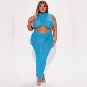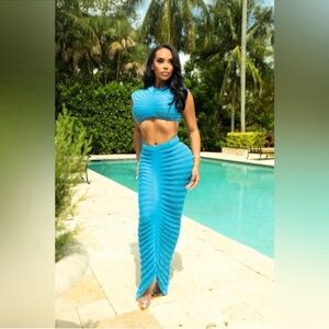 New Sheer Sleeveless Sweater Cropped Tank Top Maxi Skirt Set in Turquoise 2X