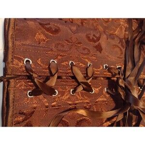 This is a new without tags plus size brown corset top with a tone on tone jacquard floral pattern, high support level, and stretch lace shoulder straps which can be worn on or off the shoulder. It features ruffle, lace, bow, and buckle accents, with boning and taped seams for structure. The corset has a toggle front closure and lace-up back, adjustable straps, and is demi-cup coverage. It is short in length and opaque in material, making it ideal for a goth / cosplay or eclectic look.