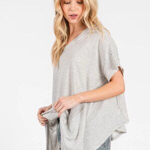 New Short Sleeve High-Low V-Neck Oversized Tunic - Heather Grey Striped
