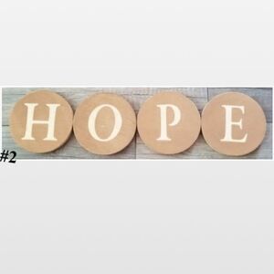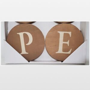 NIB Sign`Of The Times 4 individual thick wood letter circles light brown word art plaque spell out set. Due to the natural characteristics of wood, each piece will vary slightly, including the grain pattern, knots, etc.