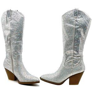 New Silver Blingy Rhinestone Knee High Cowboy Boots