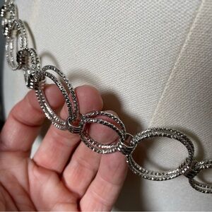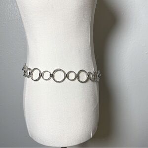 Elegant silver belt with intricate circle links. Enhances any ensemble. Lightweight