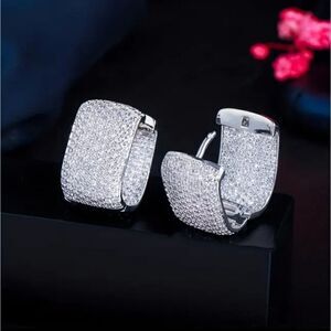 New Silver Cluster Pave Diamond Oblong Mod Huggie Hoop Earrings