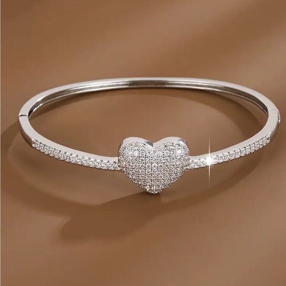 Elegant silver bracelet featuring a sparkling heart design. Perfect for adding a touch of glamour to any outfit. Pretty rhinestones hinged open and close feature. Brand new fits up to 7.5”
