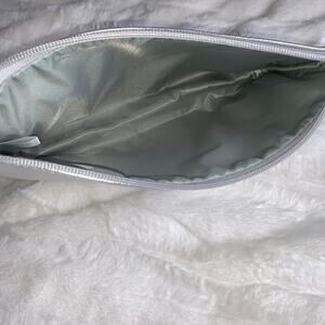 Brand new makeup pouch toiletry bag. Silver metallic makeup pouch. Silver zipper with grayish blue lining. Approximately 11" wide by 7" high.