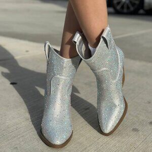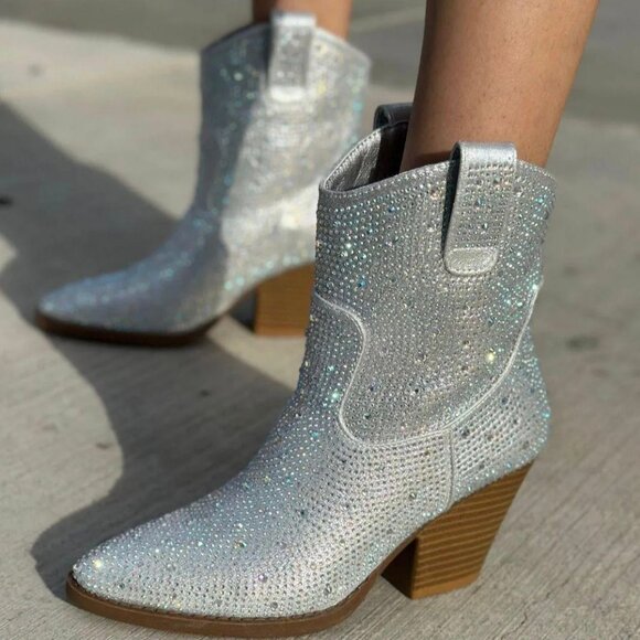 New Silver Rhinestone Embellished Cowgirl Western Ankle Boots Booties Block Heel