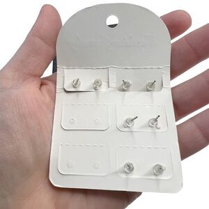 New UDOBUY Silver Tone 4 Pair Earring Set. New condition and comes with the original box. Set includes 3 stud style earrings with rhinestone crystal accents and 1 teardrop shaped dangle earrings. No precious metals or gems. Very glitzy and glamorous. For pierced ears.