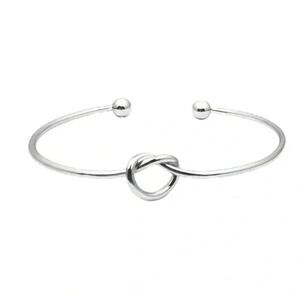 The design features a slender, open-ended band that gently tapers to rounded terminals, ensuring a comfortable fit while making it easy to slip on and off the wrist. The bracelet’s centerpiece is an artistically rendered knot, symbolizing strength, unity, and an eternal bond. This knot detail adds an element of intrigue and depth to the simple elegance of the bracelet.
