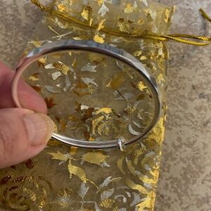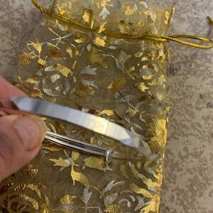New! Silver-Toned adjustable bangle bracelet with the word “Lucky” engraved on the top, and storage in a sheer gold organza gift pouch. Material: Stainless Steel.