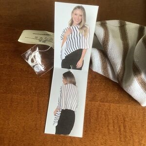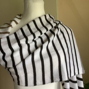 New with tags Simply Noelle Striped Scarf/Wrap. This lightweight acrylic scarf/wrap can be worn multiple ways. It even has buttons to simulate a sweater in front. Black/white stripes with gray and brown accent stripes. Perfect for travel.