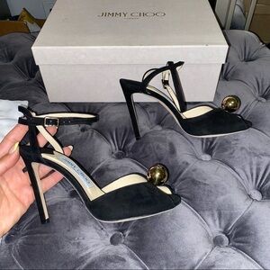 New in box. Women’s size 35. Jimmy Choo Sacora 100 faux pearl suede sandals. In the color black. Originally $950.
