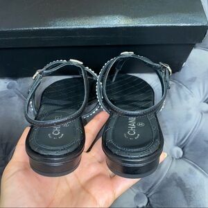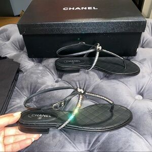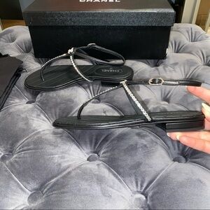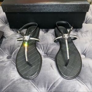 𝅺New in box. Women’s size 35.5. Chanel thong sandals. In black lambskin. Has the CC logo. Also has rhinestones.