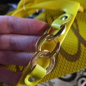 New with tags yellow and gold tone chain O'neill flip flops size 8. The chains have some patina forming and there are some marks by the toe edges that happened in storage. Please see all pictures.