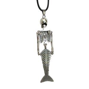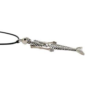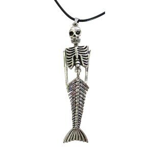 This statement necklace combines an articukated skeleton mermaid pendant with a black cord, offering a unique and edgy design suitable for gothic or alternative styles.
