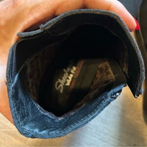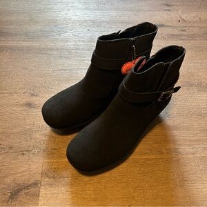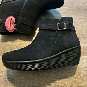 Experience the perfect blend of style and comfort with these Skechers ankle booties. Crafted in a sleek black hue, they feature a modern wedge sole for added height and a chic buckle strap detail. The rugged sole ensures a firm grip, making them ideal for casual outings.