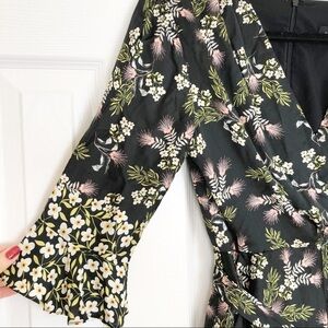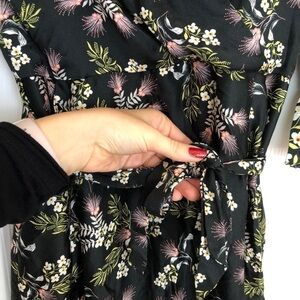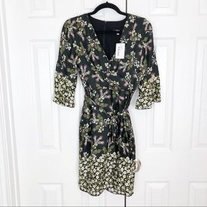 New with tags floral mini dress. 3/4 sleeves, surplice neckline, and tie waist detail. Fully lined and two side slit pockets. Please see photos for measurements.