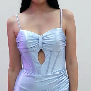 A daring yet refined choice, this sheath gown captivates with its sweetheart neckline and open back secured by a concealed zip. The leg slit and front cutout introduce modern allure, while the gathered waistline ensures a figure-flattering finish.