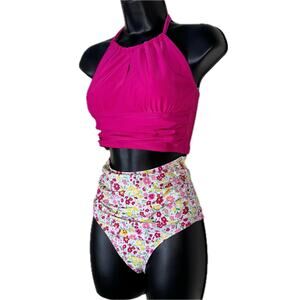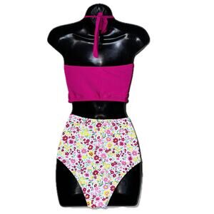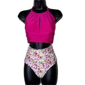New Small Maternity Tankini 2 Piece Swimsuit Swim Beach Floral Pink Halter High