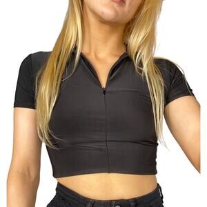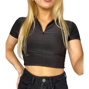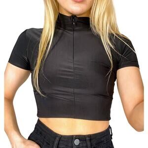New Small Slinky Black Half Zip Short Cap Sleeve High Neck Y2k Crop Top Blouse