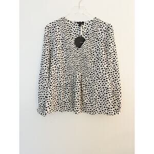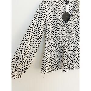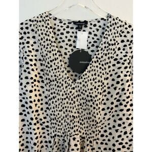 New with tag boutique brand, Mittoshop blouse features animal print/dot pattern, v neckline, smocked bib, blouson sleeves, and pleated babydoll hem.