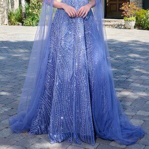 New Smoky Blue Beaded Maxi Mother Of Bride Mesh Gown w/ Cape Sleeves GL3833