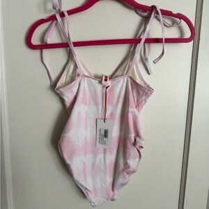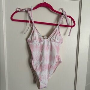 This dainty self-tie swimsuit features allover tie-dyed print.