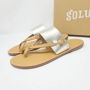 New in Box Soludos Slotted Thong. Features a metallic platinum upper and light brown nubuck thong straps and a vachetta leather footbed.