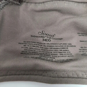 New without Tag Soma Embraceable Full Coverage Bra in Mochaccino. Smooth finish. Underwire. 3 hook and eye back closure. Adjustable straps.