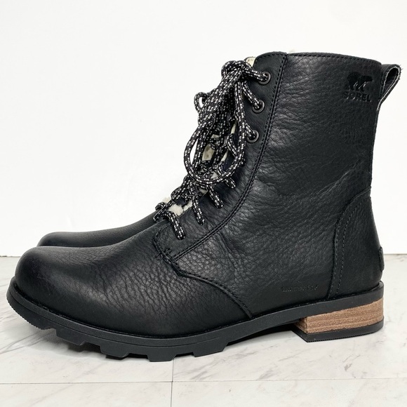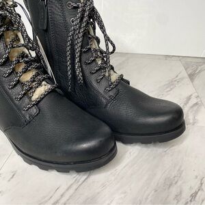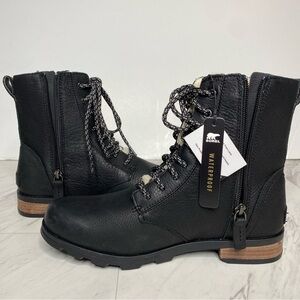New! Sorel Emelie Black Leather Short Lace Up Boot 8