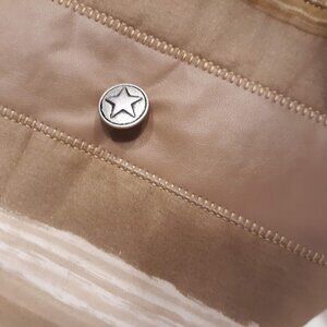 Beautiful multi-brown, tan and ivory tone outer, beige fabric lining, tan vinyl trim and strap.